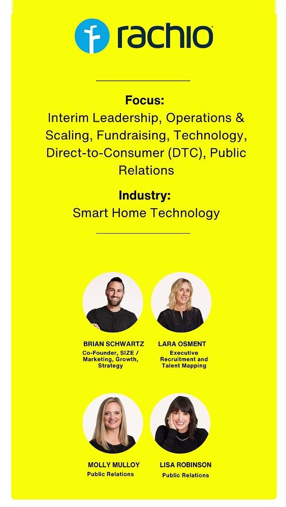 “I enjoy partnering with SIZE when recruiting team members. Working alongside their team of advisors brings deeper market insights and a collaborative approach. Together, we deliver more tailored solutions for every role, like our search for a CMO for Rachio with a strong background in growth marketing and consumer tech—adding immense value through enhanced intelligence and expertise.”